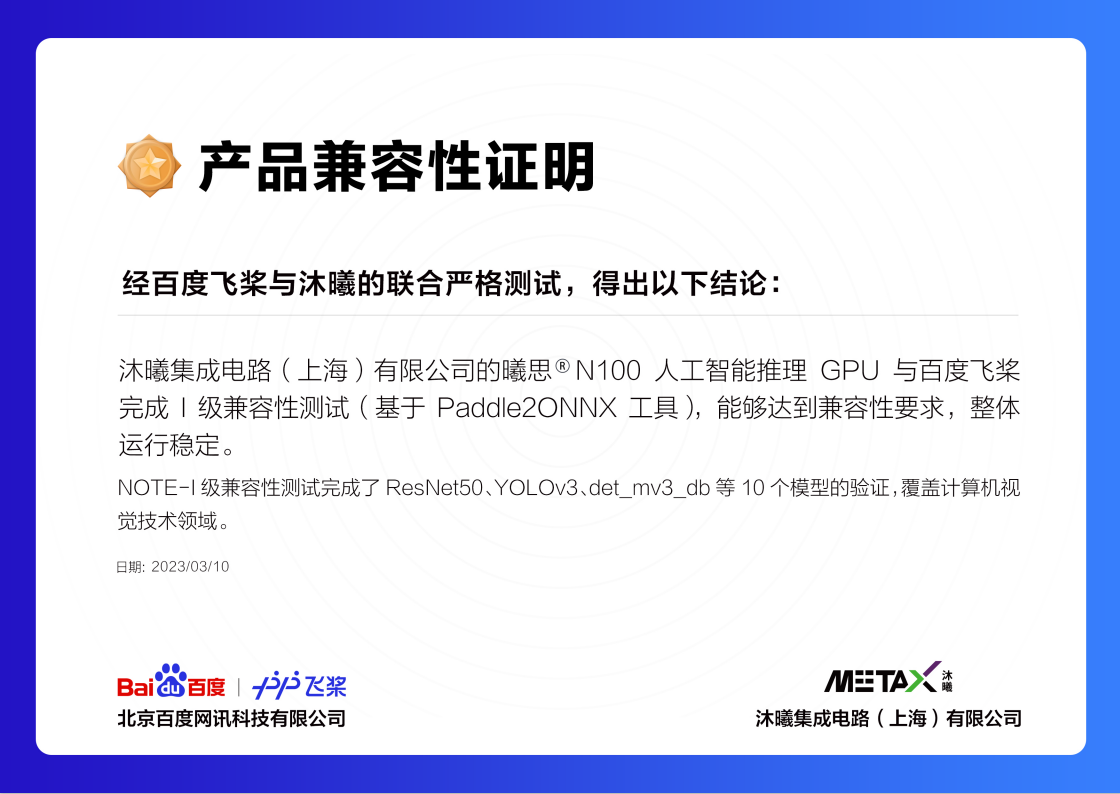 本次I级兼容性测试基于Paddle2ONNX工具,完成了计算机视觉技术领域包括图像分类、目标检测和OCR等共计10个模型的验证。经双方联合严格测试表明,曦思®N100在ResNet50、YOLOv3、det_mv3_db等模型上的精度和性能的表现满足要求,与飞桨的兼容性良好,整体运行稳定,达到了I级适配互认要求,推理性能可以满足用户的应用需求。