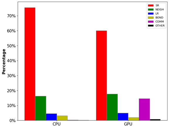 图2:LAMMPS分子动力学模拟中各模块的计算开销占比。其中,SR为近程力计算开销,NEIGH为邻近列表构建开销,