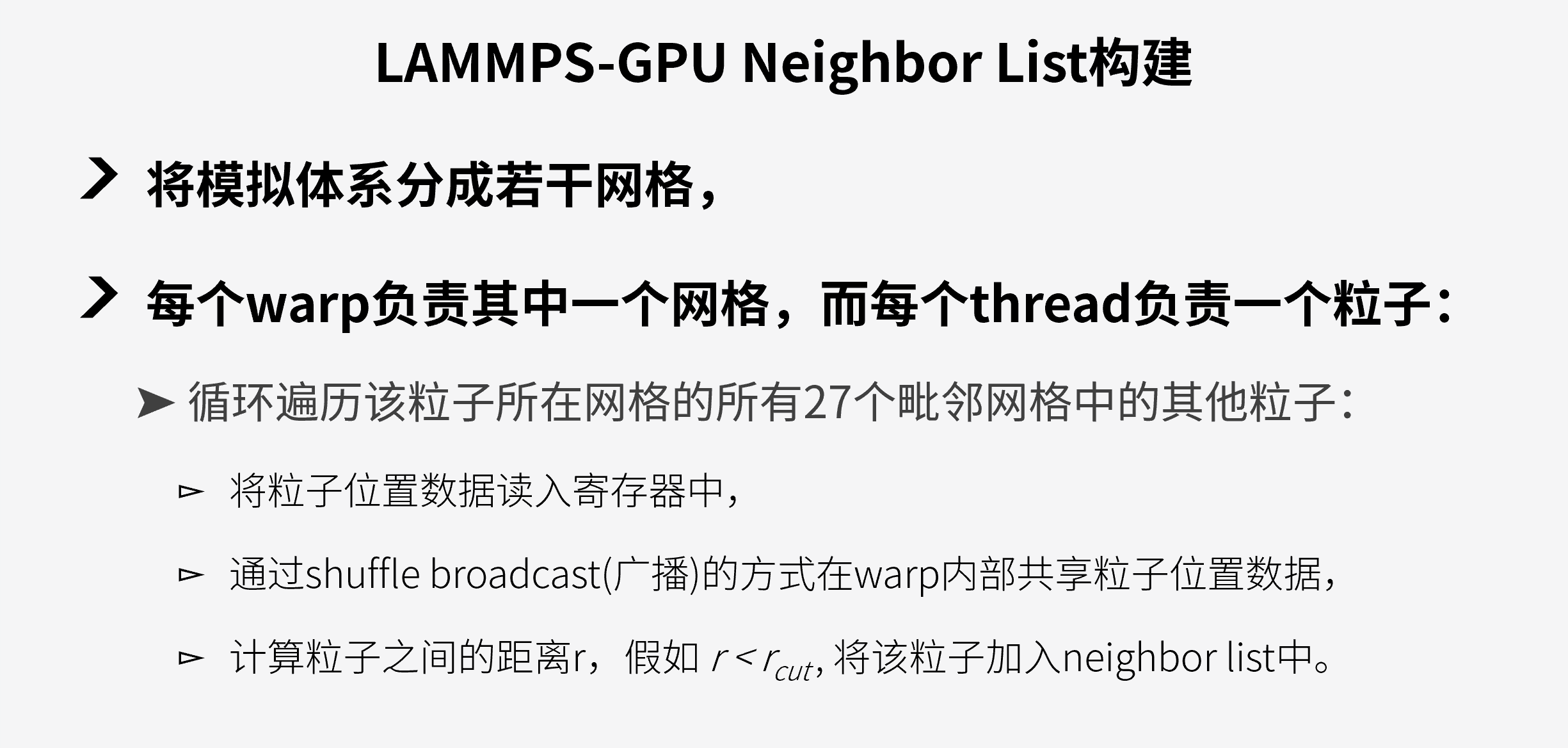 2)网格是通过空间坐标均匀划分的,当处理非均质体系时各warp需要处理的粒子数差异较大,易造成线程分歧(thread divergence)。