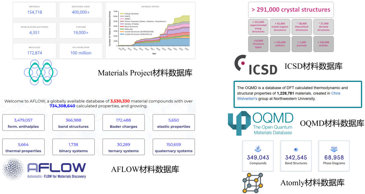 国内的MatCloud高通量材料集成设计平台也具有相似的工作机制,通过调用VASP或CASTEP等第一性原理软件在超级计算机上进行大批量计算,再将相应的计算结果保存到数据库中,最终通过大数据分析来指导新材料设计。另一个国内材料数据库的典型代表之一,Atomly晶体材料数据库,是由中科院物理研究所特聘研究员刘淼领导开发,其曾是Materials Project的开发成员之一,2018年加入物理所,专注于材料数据库开发和基于数据的材料研发,并建设一套源自物理所的无机晶体材料计算数据库:Atomly.net。Atomly数据库包含了接近40万个无机晶体材料的第一性原理计算结果(包含电子结构信息:DOS + energy bands),数据的数量和质量已经和其它世界知名数据库比肩,如图 1所示。