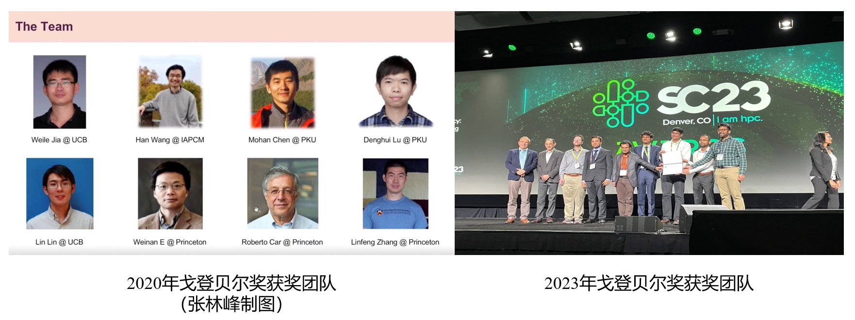 2020年,由中美合作的研究小组(包括来自 UC Berkeley 的博士后贾伟乐、副教授林霖,北京应用物理与计算数学研究所计算物理实验室的研究员王涵,北京大学助理教授陈默涵,北京大学研究生路登辉,普林斯顿大学化学系教授 Roberto Car、数学教授鄂维南以及普林斯顿大学数学系和化学系博士张林峰,如图2所示)摘得戈登贝尔奖,他们使用科学计算+AI+Physical model结合的方法,通过机器学习,将具有第一性原理精度的分子动力学模拟的极限提升至上亿个原子的体系规模,同时又确保了第一性原理计算的高精确度,且模拟时间尺度相较于传统方法至少提高了1000倍[18]。该团队开发的高度优化的代码 (GPU Deep MD-Kit) 所代表的科学计算+AI+Physical model结合的方法势必会在力学、化学、材料、生物甚至工程领域解决实际问题中发挥更大作用。