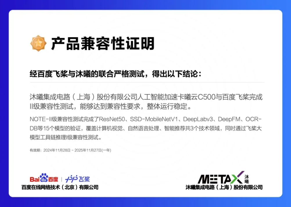 产品兼容性证明本次Ⅱ级兼容性测试完成了涵盖自然语言处理、计算机视觉、智能推荐共计3个技术领域的15个模型的验证。双方联合严格测试表明,曦云C500通用计算GPU在上述15个模型上的精度、速度等各方面表现满足要求,与飞桨的兼容性良好,整体运行稳定,达到了Ⅱ级适配互认要求,可以满足用户的应用需求。