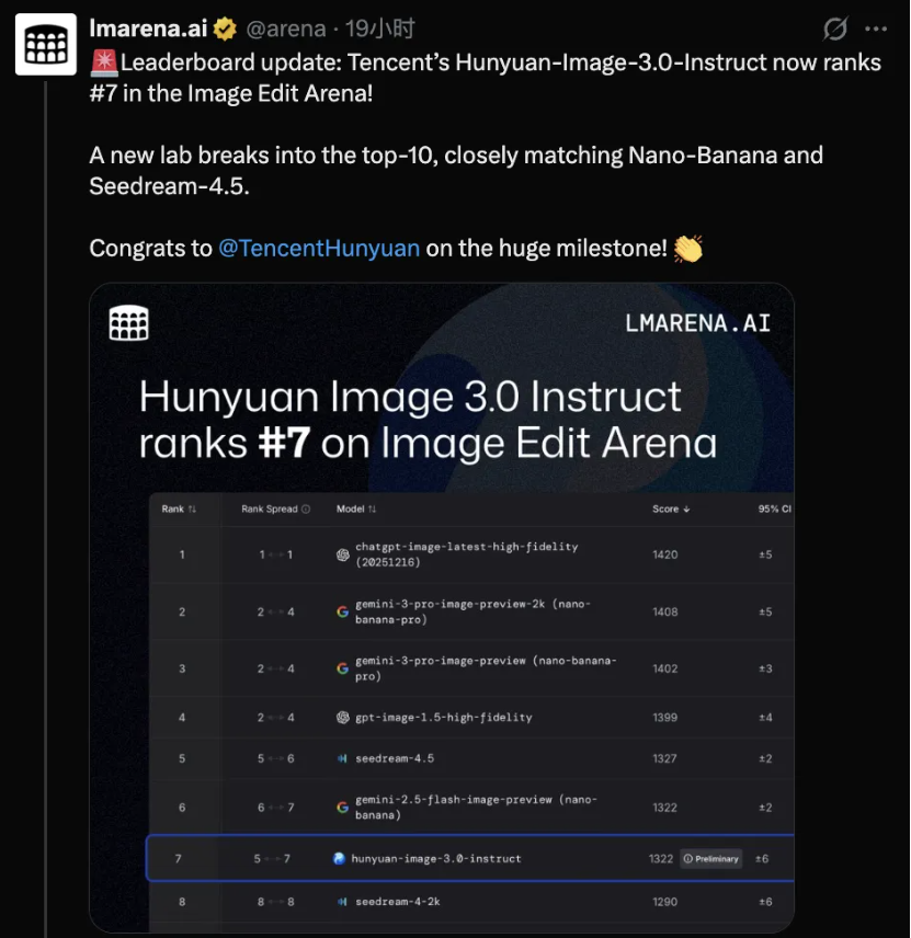 在最新的LMArena图片编辑榜单上,腾讯混元图像3.0图生图位列全球第七,也是前七名里面唯一开源的模型。LMArena官方X祝贺混元图像3.0图生图“在图片编辑磅榜单中与Nano-Banana和Seedream-4.5等表现相当”。这一成绩来自于对模型图像编辑能力的全面盲测评估,包括指令遵循、编辑精确度和输出质量等多个维度。