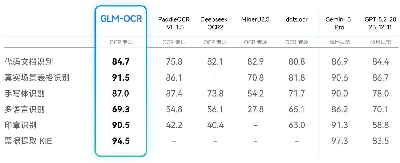 得益于自研 CogViT 视觉编码器与深度场景优化,GLM-OCR 实现了“小尺寸,高精度”。