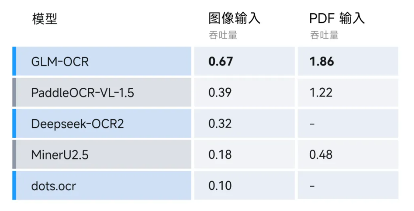 速度方面,智谱对比了在相同硬件环境与测试条件下(单副本,单并发),分别以图像文件和 PDF 文件为输入,不同 OCR 方法完成解析并导出 Markdown 文件的速度差异。结果显示,GLM-OCR 处理 PDF 文档的吞吐量达 1.86 页/秒,图片达 0.67 张/秒,速度显著优于同类模型。